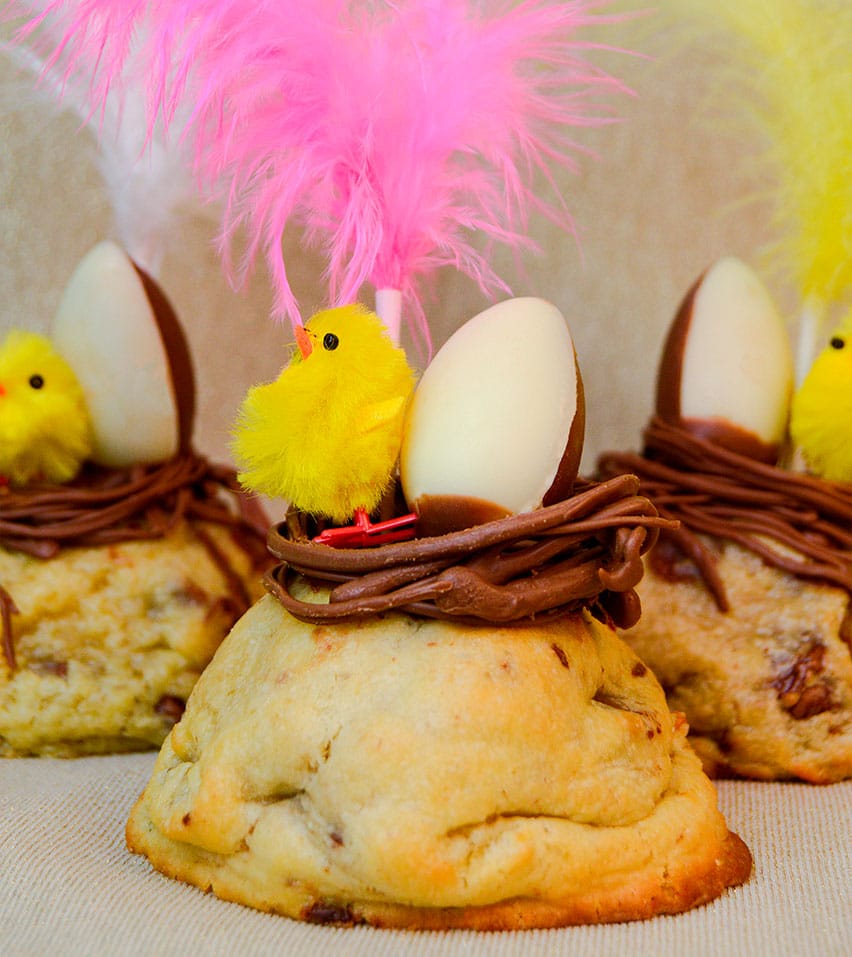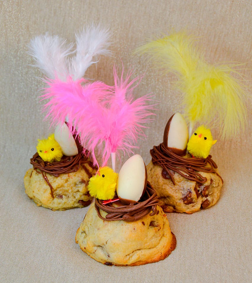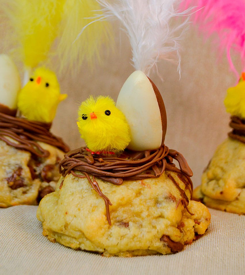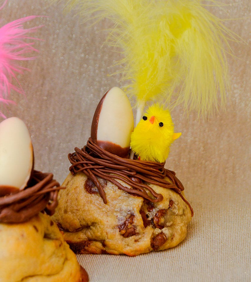 Tiene una base de cookie rellena del sabor que elijas con un nido de chocolate y su clásica decoración con huevito, pollito y pluma. Sencilla, bonita y riquísima, perfecta para regalar a tu ahijado/a, hijo/a, sobrino/a… o para ti. 🍪🐣