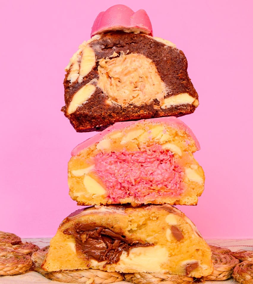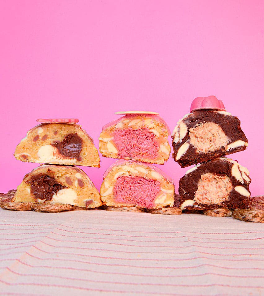 - Pink Dubai: Galleta de masa de chocolate con chispas de chocolate con leche y relleno de nutella con Kataifi tostado, decorado con chorreo de chocolate rosa y chocolatina de «Felicidades Mamá».