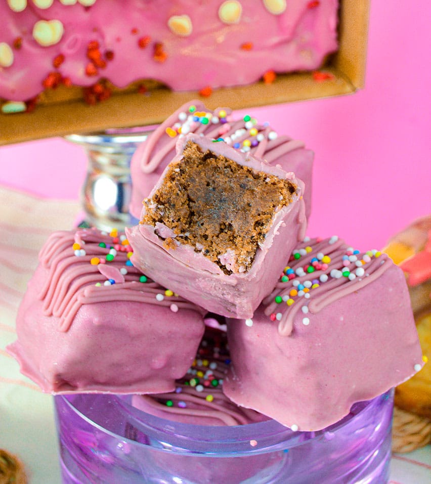 🌸 Mini cuadraditos de brownie bañados en chocolate.