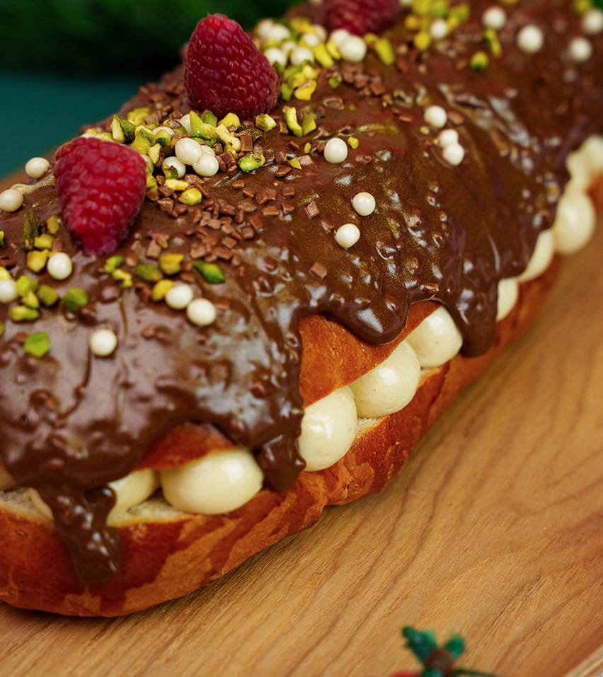 Está hecho con masa de brioche esponjosa, glaseado con Rocher almendrado, relleno de crema Kinder y decorado en dorado con chocolatinas y frambuesas. Un tronco dulce original, vistoso y súper rico para quedar increíble estas fiestas.